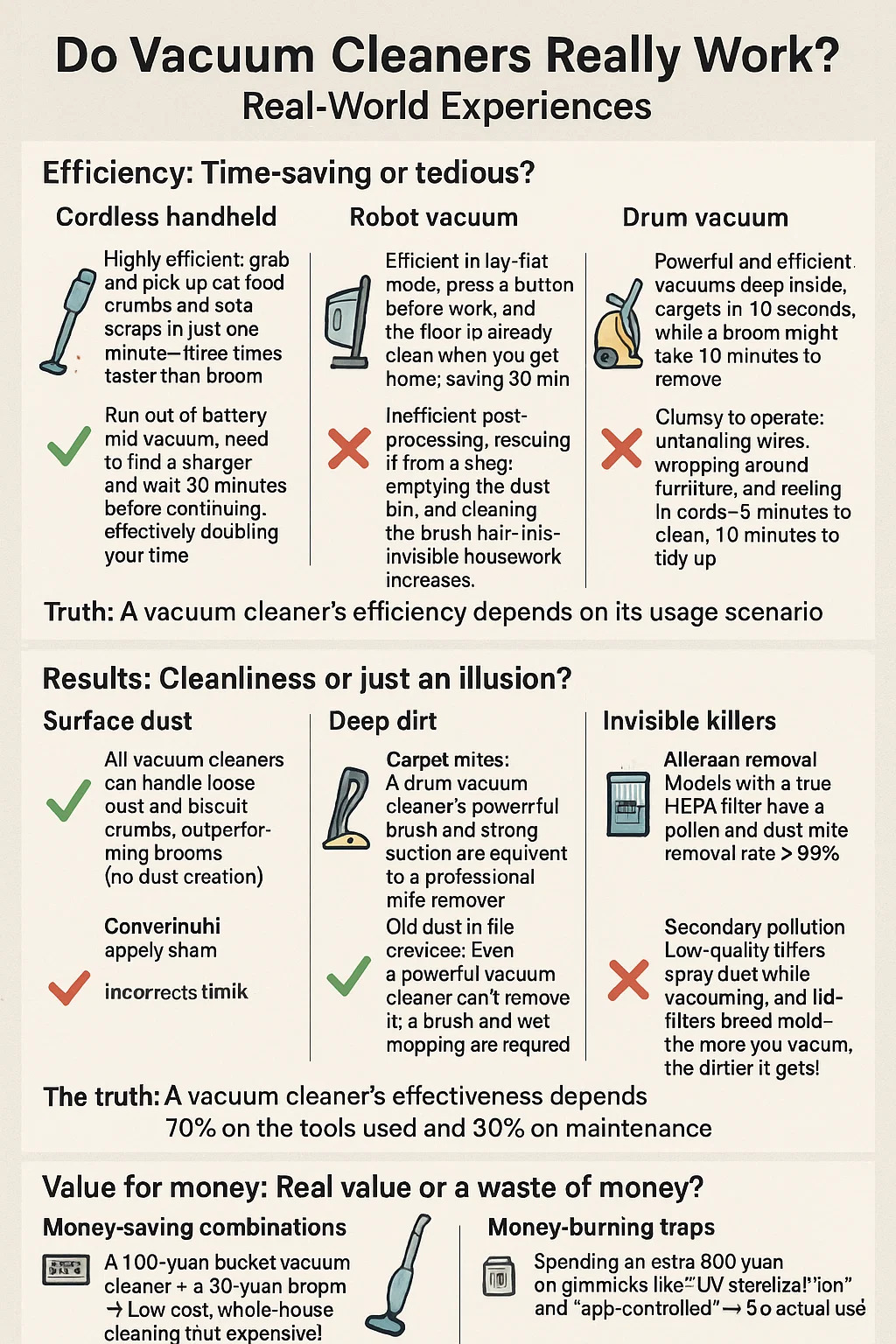 Robotvakuum: Effektiv i lay-fladtilstand: Tryk på en knap før arbejde, og gulvet er allerede rent, når du kommer hjem, og gemmer 30 minutter dagligt. Ineffektiv efterbehandling: Redning af den fra en ulempe (som at sidde fast på skalaen), tømme støvskopen og rengøre børstehåret-usynlige husarbejde øges.