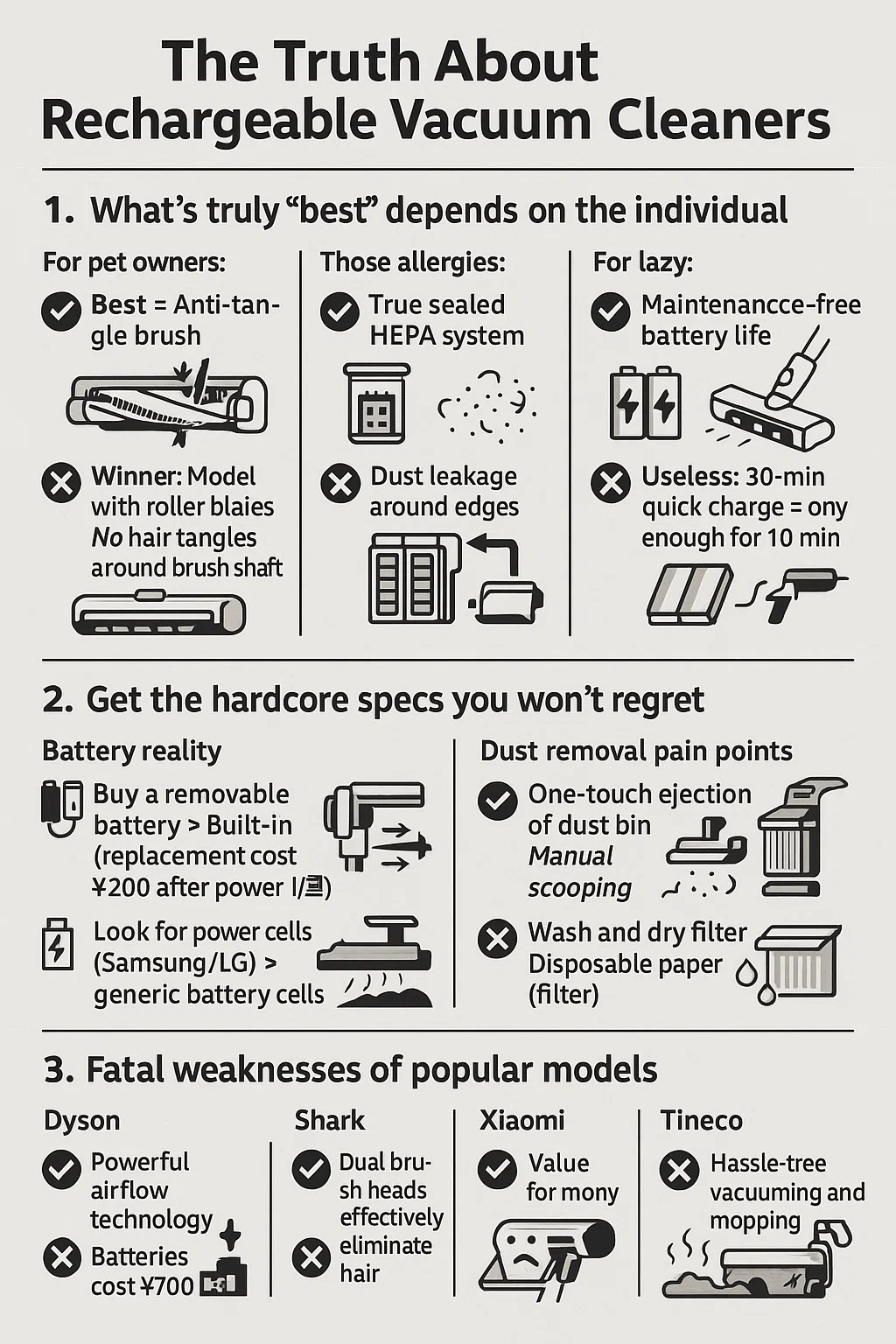 For kæledyrsejere: "Bedste" = Anti-Tangle Brush No Hair floter omkring børsteakslen. Vinder: Model med rulleblader (suger og skærer samtidig, hvilket eliminerer adskillelse). Gimmick: 200AW Sugningskraft, men rullebørsten kræver en halv times manuel hårfjerning.
